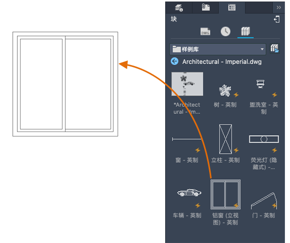 这将打开“块”选项板,并使其处于活动状态。默认情况下,该浏览器固定在应用程序的右侧。