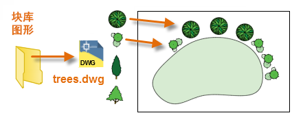 - 图形文件中包含一个或多个块定义。例如,可以创建仅包含树块定义的图形。然后,您可以将该图形中的任何块插入到当前图形中。包含相关块族的图形文件通常称为块库图形。