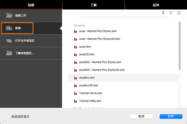 所有这些设置都可以保存在图形样板文件中。单击“新建”以从下面几个图形样板文件中进行选择: