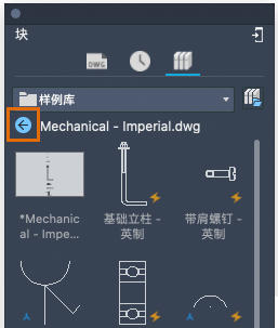 双击文件夹中的图形,即可显示该图形中的块。使用“后退”按钮可返回到所选文件夹。