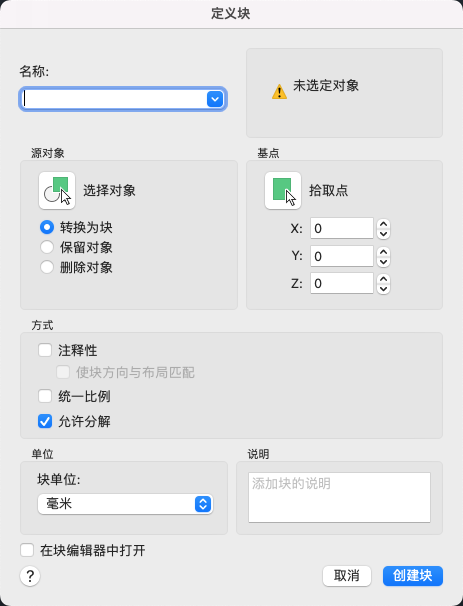 暂时关闭“块定义”对话框,允许用户选择块对象。选择完对象后,按 Enter 键可返回到该对话框。