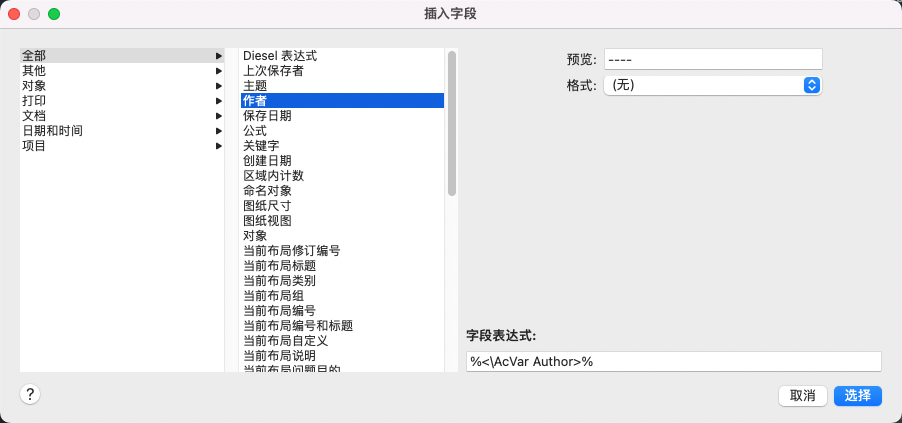 在“字段名称”中选择“命名对象”时,将显示图形中命名对象的类型列表。选择“对象”时,将显示选定对象的类型。使用“选择对象”按钮可以暂时关闭该对话框,然后在图形中选择对象。