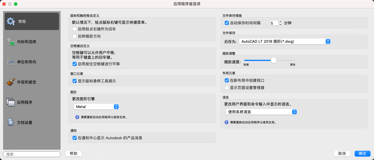 保存间隔分钟数:在“自动保存”为开的情况下,指定多长时间保存一次图形。(SAVETIME 系统变量)