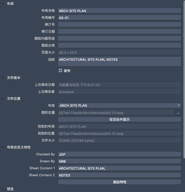 显示特定于选定布局的信息,例如名称、编号以及是否包含在发布操作中。还显示自定义特性(如果有)。