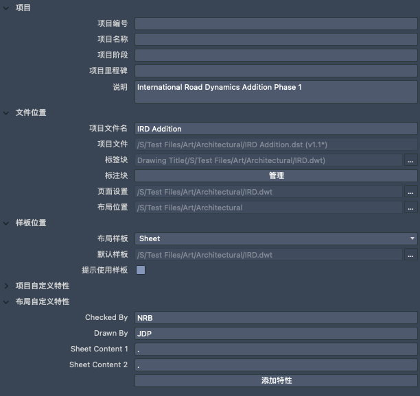 显示项目的路径、页面设置替代和项目使用的标注和标签块。