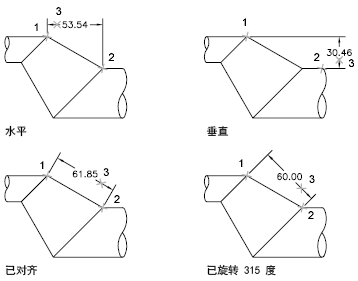在四幅图中,分别将尺寸界线原点明确指定为 1 和 2。尺寸线位置指定为 3。
