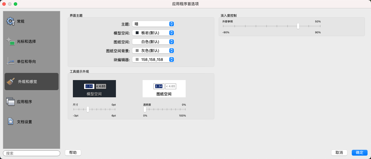 控制哪些主题应用到诸如状态栏、选项板和图形窗口的元素。您可以从深色或浅色主题中进行选择。