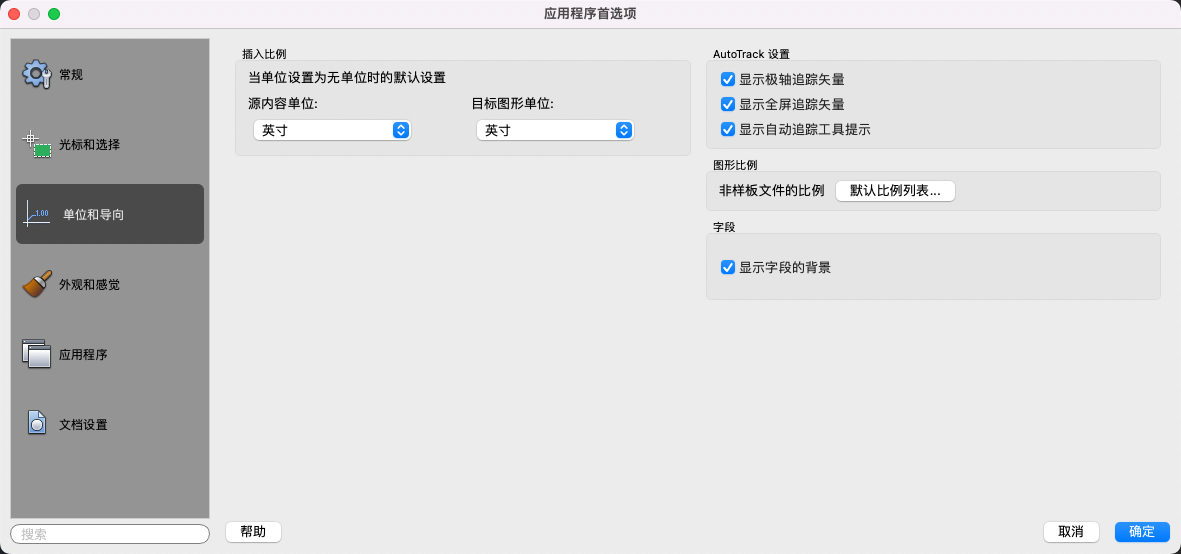 “单位和导向”选项卡(“应用程序首选项”对话框)