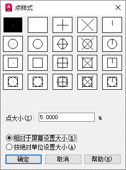 设定点的显示大小。可以相对于屏幕设定点的大小,也可以用绝对单位设定点的大小。点的显示大小存储在 PDSIZE 系统变量中。以后绘制的点对象将使用新值。