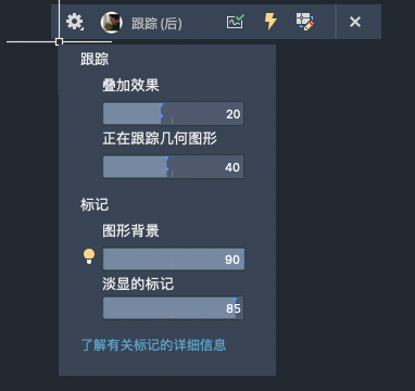 跟踪中的几何图形:调整背景中跟踪几何图形的透明度。当 TRACEFRONT 处于启用状态时,图形中的几何图形会受影响。当 TRACEBACK 处于启用状态时,跟踪中的几何图形会受影响。