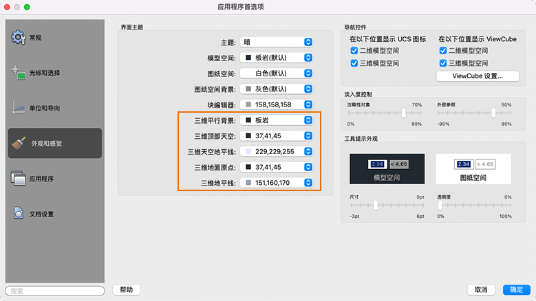 在 AutoCAD 的“首选项”对话框中,“外观”选项卡现在有用于自定义三维视觉样式背景颜色的设置(包括平行模式和透视模式)。