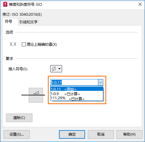 在 AutoCAD Mechanical 2024 工具集中,系统会在创建或编辑符号期间动态地自动计算锥度和斜度符号。在您选择计算的基线之后,锥度和斜度计算将始终保持不变。创建或编辑符号时,您可以选择不创建计算符号,或手动编辑计算出的值。文字 <原始> 将显示在锥度和斜度比率旁边。