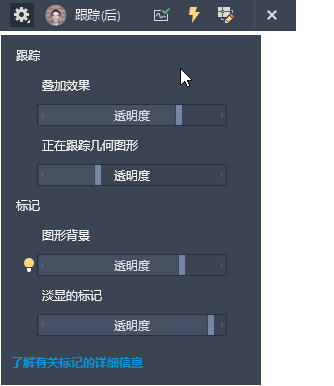 淡显的标记。当数字标记处于活动状态时,控制淡显标记的透明度。数字越小,标记越明显。“淡显标记”滑块可修改 TRACEMARKUPFADECTL 系统变量。