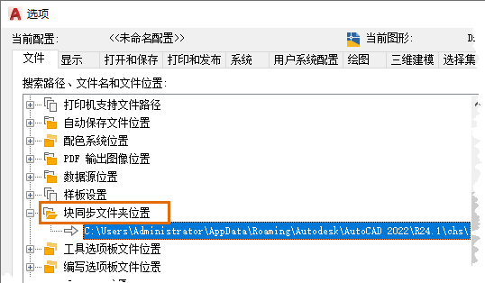 在这种情况下,可以在“选项”对话框的“文件”选项卡中更改最近使用的块文件夹位置,然后指定云存储位置以同步块。