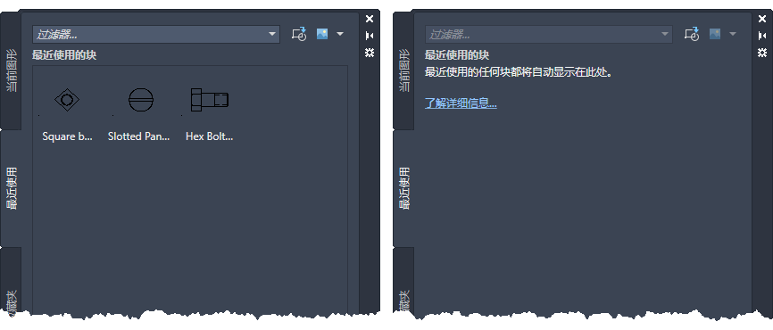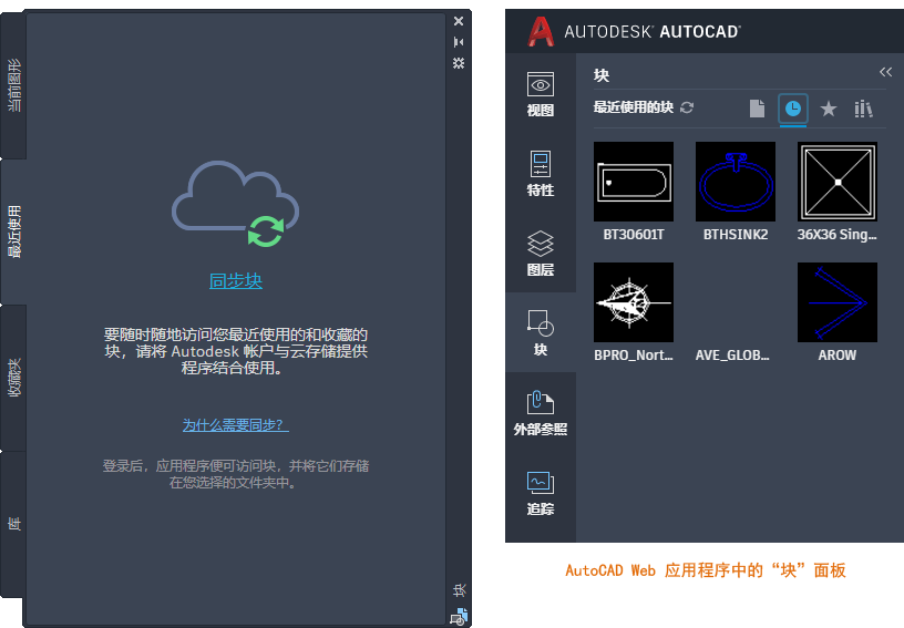 如果当前图形中已经存在最近使用的块或没有使用“块”选项板登录 Autodesk 帐户,则“同步块”选项可能不会显示在“块”选项板中。
