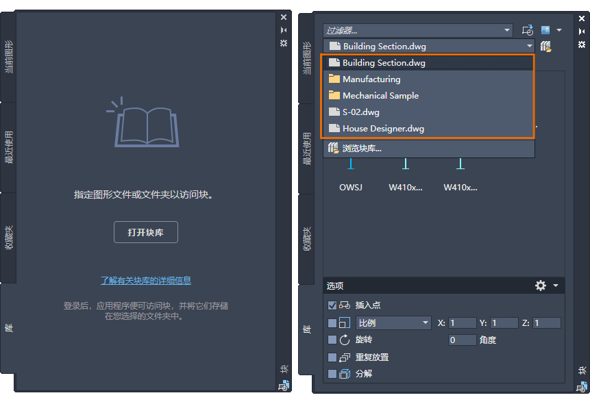 “块”选项板的“其他图形”选项卡已重命名为“库”选项卡。现在,可以指定文件夹、图形文件或存储在图形中的任何块定义,以作为块插入到当前图形中。“库”选项卡包含一个下拉列表,其中显示了 5 个最近使用的块库(文件夹或图形文件),以便更快地访问。 如果选择云存储位置中的块库,则可以在 AutoCAD Web 应用程序上使用相同的块。