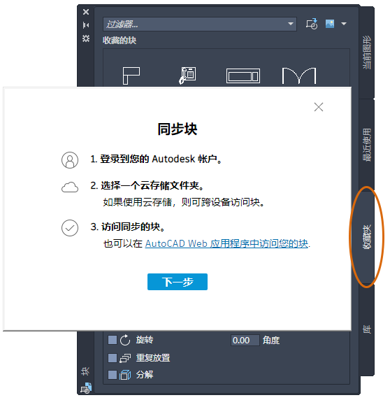 对“块”选项板新增了许多增强功能,包括改进了设置和控制第三方云提供程序(用于跨设备使用块)以及新的“收藏夹”选项卡。