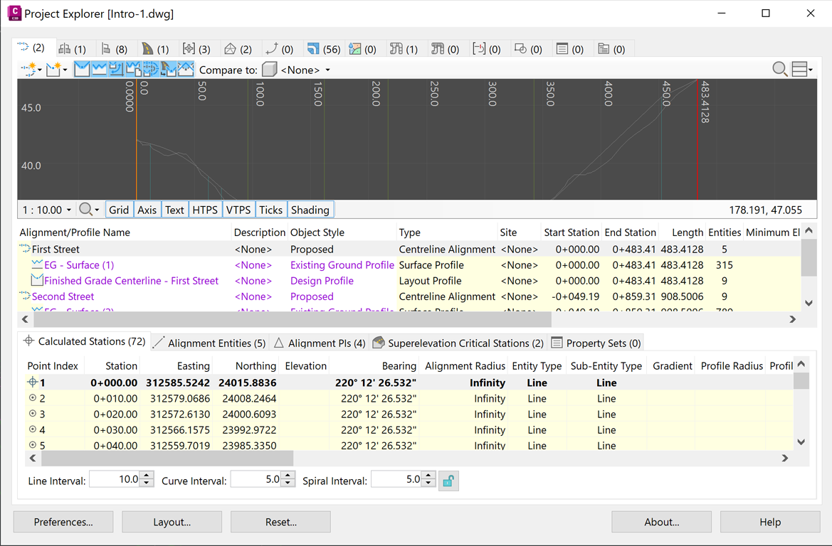 某些对象类别在窗口的上半部分包含动态纵断面图或横断面图。通过这些视图可在纵断面或横断面中查看选定对象,无需绘制纵断面图或横断面图。当需要更新时,视图会响应,并且包含许多实用的工具,旨在帮助您更好地理解所显示内容的基础结构。有关更多详细信息,请参见“纵断面图和横断面图”主题。