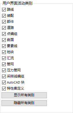 在 Project Explorer 中执行特定任务时,有时最好在未在使用中的 Civil 3D 窗口中禁用或隐藏任何 Project Explorer 对象类别。