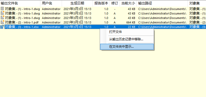 在列表中的任意项上单击鼠标右键访问相关选项,以打开生成的文件,在 Windows 资源管理器中打开从中创建生成文件的文件夹,或从输出历史记录列表中删除各个条目。