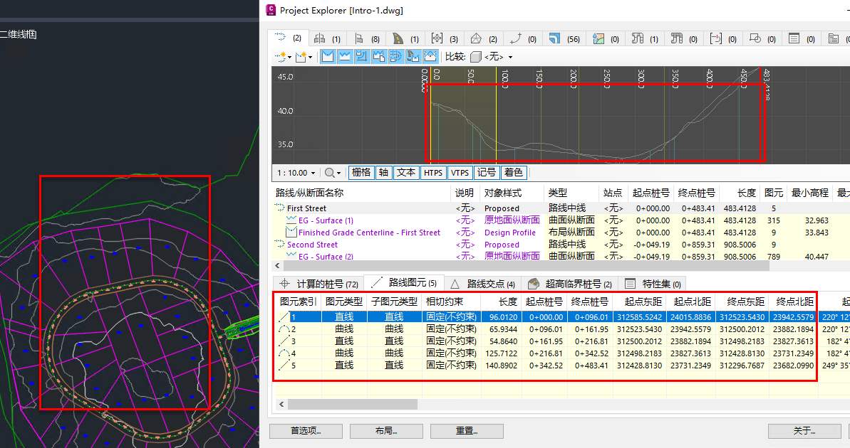 在 AutoCAD 视口中进行缩放、平移或临时亮显的键盘快捷键还适用于许多 Civil 3D 对象的子对象层级。例如,使用上面列出的键盘快捷键,可以: