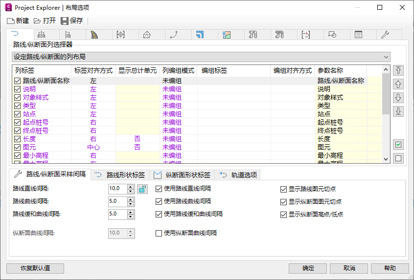 除了标准列布局和标签选项外,“布局选项”窗口中的“路线”选项卡还提供了一系列专用选项,用于控制与路线和纵断面相关的桩号和图元数据的显示和格式。