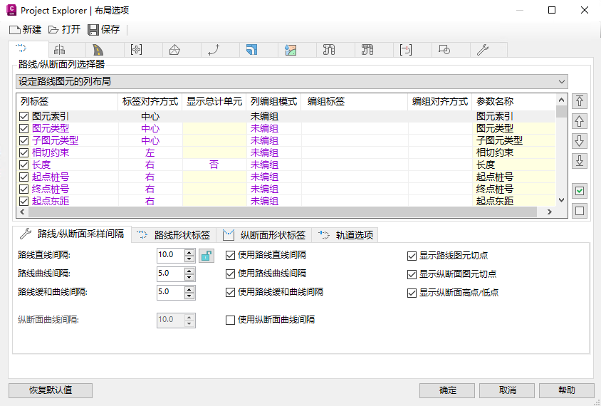 - 在“布局选项”对话框的“路线”选项卡中,确保已选择“设定路线/纵断面的列布局”。