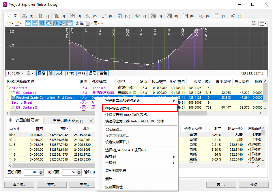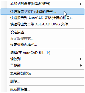 确保已选择“计算的桩号”子对象选项卡,在选定的纵断面上单击鼠标右键,然后从右键菜单中选择“快速报告到文件(计算的桩号)”。