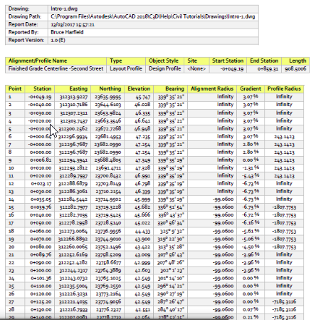 本教程演示了如何使用 Project Explorer 将简单的 Civil 3D 路线/纵断面报告生成为 PDF 文件。然后,您将同一报告写入 Excel XLSX 文件。