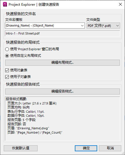 如果要更改报告的布局或样式,请在 Project Explorer 窗口中的同一对象上单击鼠标右键,然后再次选择“快速报告到文件”选项。系统将记住您在以前快速报告中的首选项。