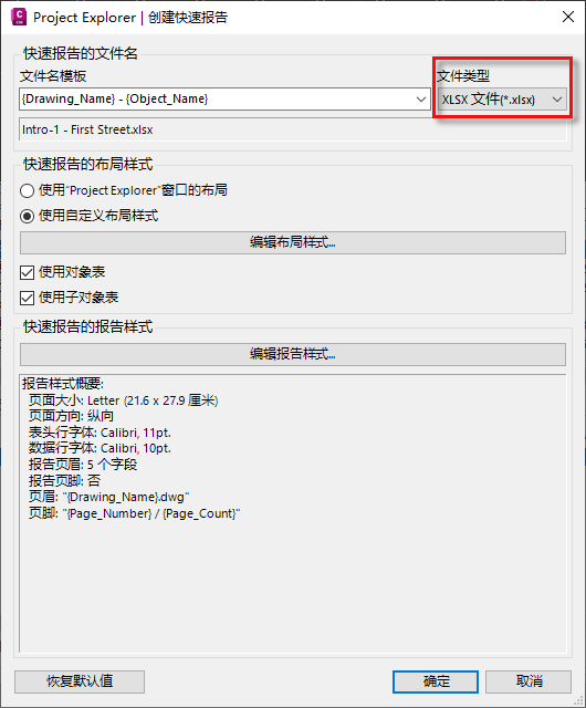 - 确保将“文件类型”下拉列表设置为“PDF 文件”。请注意,在创建过程中,引出报告文件的文件名可以从一系列动态变量中导出,也可以在此对话框中指定固定文件名。默认情况下,报告文件名将由图形名称和选定对象名称组合而成。