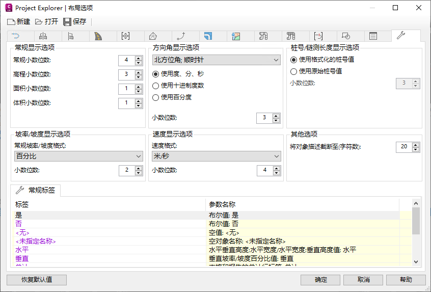 - 选择“常规”选项卡并记下此处的选项,以设置角度/方向角、桩号、高程和坡度等数值的格式。此处应用的更改仅影响引出快速报告。