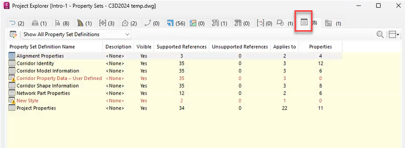 “特性集”子对象选项卡位于 Project Explorer 中任何受支持的对象选项卡中,可以通过单击“点编组”选项卡、“管网”选项卡和“压力管网”选项卡下的“显示/隐藏子对象特性集”按钮来显示或隐藏该选项卡。