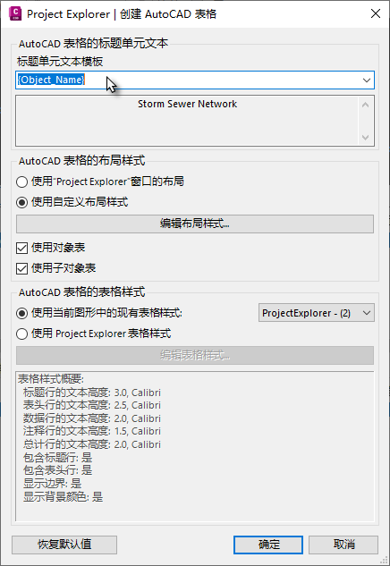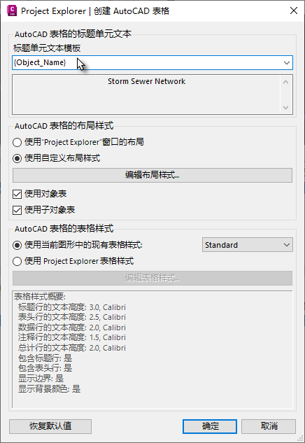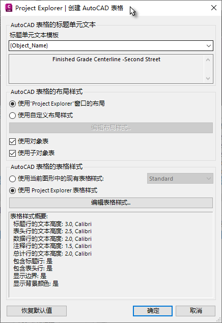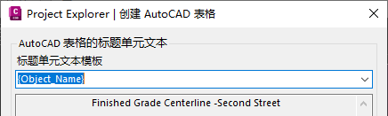 请注意,在创建过程中,AutoCAD 表格的标题行可以从一系列动态变量中导出,也可以在此对话框中指定固定的文件名。默认情况下,标题行将显示选定对象的名称。