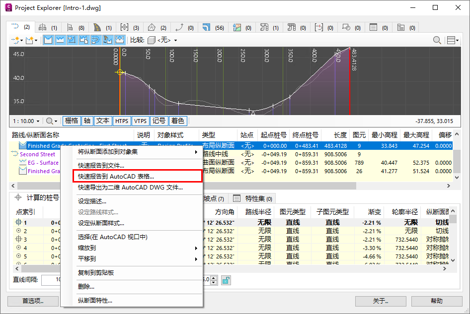 本教程演示了如何使用 Project Explorer 将两个静态 AutoCAD 表格放置到 Civil 3D 图形中。第一个表格将包含简单的 Civil 3D 路线/纵断面报告。第二个表将包含从 Civil 3D 管网导出的管道铺设报告。