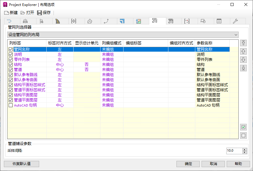 从列表视图中,确保仅选中以下列:“距离”、“零件名称”、“东距”、“北距”、“出口管内底标高”、“管内底标高”、“入口管内底标高”、“比较”、“对照高程”、“对照偏移(Z)”。