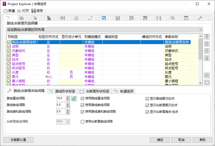 在“纵断面图”工具栏上,进行以下参数更改: