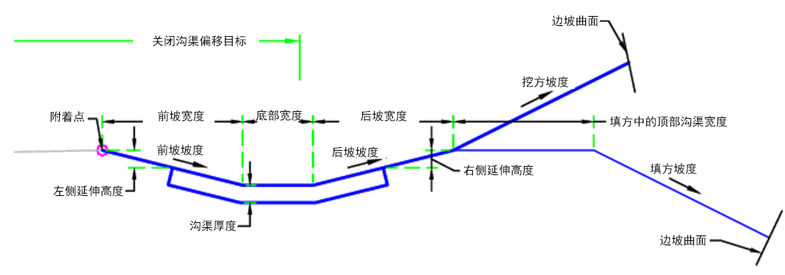 | 忽略沟渠 | 可用于关闭沟渠的构造。以下对象类型可用作用于指定此偏移的目标:路线、多段线、要素线或测量地物。 | 可选 |