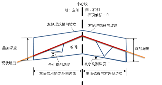 路拱使用纵断面选项 选择该功能可将加铺路拱点的内侧边缘连接到纵断面,或者调整路拱点高程以满足最小铣刨深度。 用户定义 最小铣刨深度