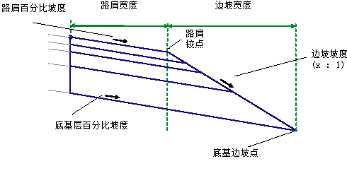 将从附着点向外插入给定“路肩宽度”和“默认路肩坡度”的路肩完工坡面。底基连接将从起始于完工坡面下方“底基深度”的附着点插入。