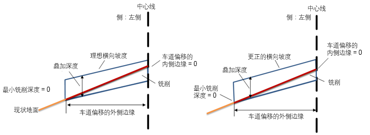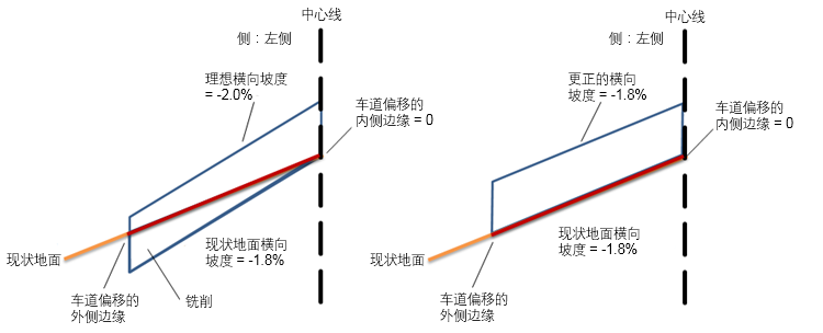 外侧或内侧车道超高将替换理想横向坡度。铺装层的更正的横向坡度值将由横断面的超高表定义,而不是由理想横向坡度定义。