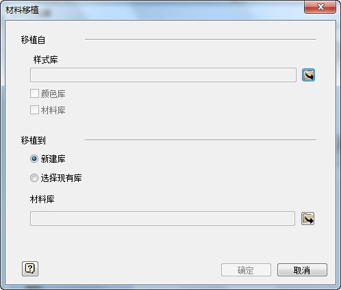 注: 如果材料已移植到材料库中,则颜色将在同一时间自动移植。因此,在“外观浏览器”对话框中,您可以使用“打开现有库”加载移植的材料库。
