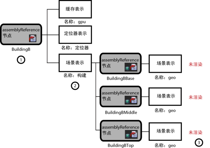 即使 geo 表示存在于集合引用层次(在嵌套 assemblyReference 节点 BuildingBBase、BuildingBMiddle 和 BuildingBTop 内)中,也无法找到、激活或渲染这些表示。因为 Maya 会首先查找顶层集合引用节点,所以 BuildingB assemblyReference 节点必须包含名为 geo 的表示,Maya 才能继续在层次中进行搜索。