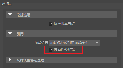 - 在打开场景选项(Open Scene Options)的“引用”(Referencing)选项区域中,启用“选择性预加载”(Selective Preload),然后单击“打开”(Open)。