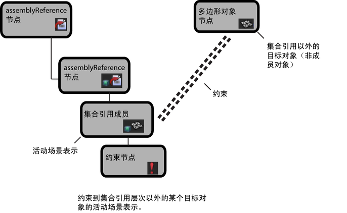 如果顶级 assemblyReference 节点是目标对象或受约束对象,则切换表示时约束行为将保持。例如,如果 assemblyReference 节点被约束为目标对象,则集合表示从“场景表示”(Scene representation)切换为“缓存表示”(Cache representation)时,约束行为不会改变。