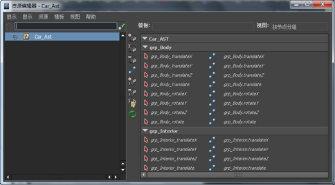 对于描制的汽车模型,资产会封装车身、车内、轴、灯光和车门的组节点。