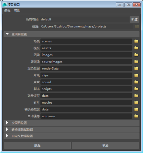 - 列出当前的主项目目录。创建新项目时,默认情况下 Maya 会创建这些目录。主项目位置提供重要的项目数据(例如场景文件、纹理文件和渲染的图像文件)的目录。
