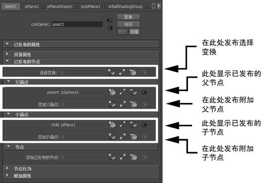 在“属性编辑器”(Attribute Editor)中“资产”选项卡的“已发布的节点”(Published Nodes)区域下,分别单击“添加父定位点”(Add Parent Anchor)或“添加子定位点”(Add Child Anchor)字段旁边的发布按钮 (