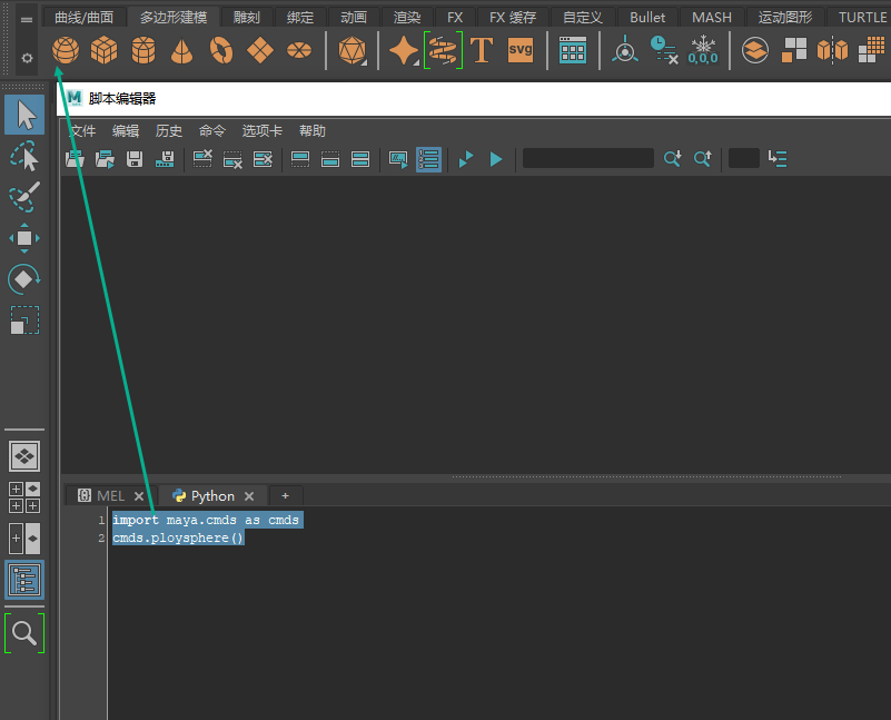 也可在命令行输入简短的 Python 命令。通过切换可选择输入 MEL 命令或 Python 命令。