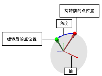在绕指定轴以指定弧度数旋转后,返回一个代表点位置的向量。从轴端点位置向下看,旋转方向为逆时针。